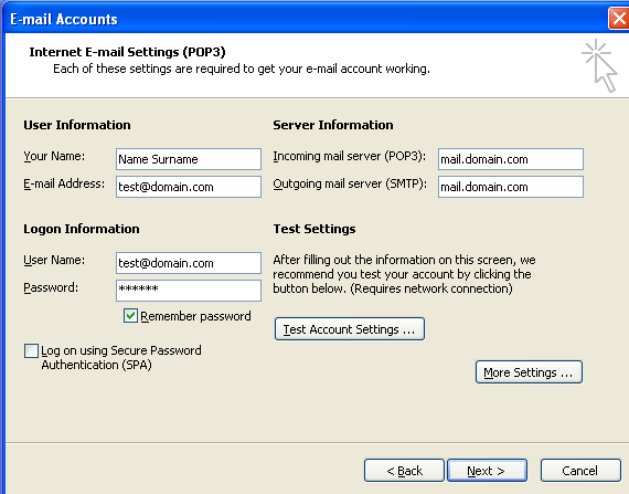 4- İnternet E-mail Settings penceresinde, gerekli alanları doldurup More Settings 'e tıklayın. Hesap ve sunucu bilgileri size ayrıca gönderilecektir.