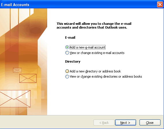 2- E-mail Accounts penceresinde, Add a new e-mail account seçeneğini işaretleyip Next 'e tıklayın.