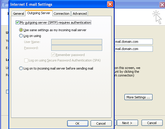 Choose Outgoing Server tab and click My outgoing server (SMTP) requires authentication checkbox and be sure Use same settings as my incoming mail server option is selected. Then click OK and Next.