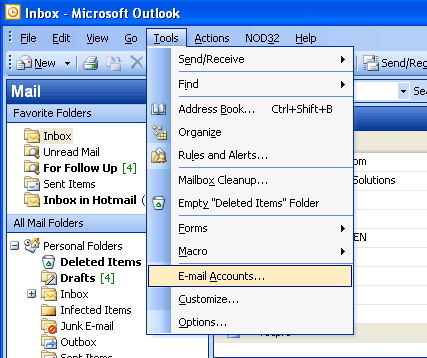 1- Outlook'ta, Tools menüsünden E-mail Accounts seçin.